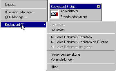 Ein mit BodyguardXT geschütztes Dokument kann nur dann geöffnet werden, wenn BodyguardXT in QuarkXPress aktiv ist, und der Anwender ein Paßwort eingibt. Ansonsten bleibt es fremdem Zugriff generell verschlossen.