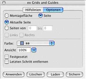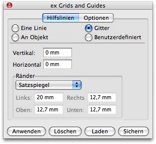 Die XTension ex Grids&Guides ermöglicht das Erzeugen von Hilfslinien über eine numerisch einzugebende Position. Weiter lassen sich freie Layoutraster definieren. Die so erzeugten Hilfslinien sind wahlweise nur auf bestimmte oder alle Seiten eines Dokumentes anwendbar und sie sind nachträglich auch einzeln veränderbar. Der jeweils letzte Schritt läßt sich rückgängig machen.